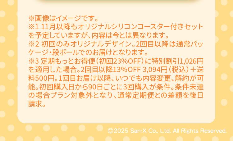 ※1 初回購入日から90日間、初回23%OFF・2回目以降13%OFF。91日目以降も90日ごとの自動更新で13%OFF。自動更新を希望しない場合はマイページより変更可能です。 ※2 初回購入日から90日ごとに3回のご購入が条件です。条件未達の場合はプラン適用対象外となり、通常定期便との差額を期間終了日の翌日または解約時にご請求します。